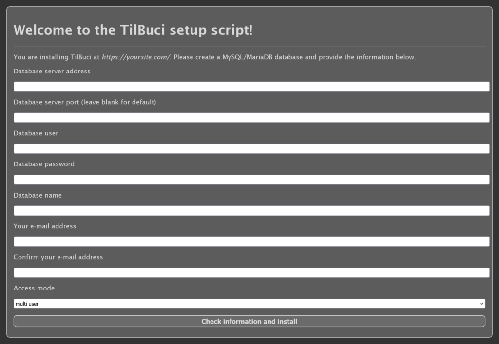 Time to run the setup.php script. Access it from your browser. You must fill the required information and click the Check information and install button.